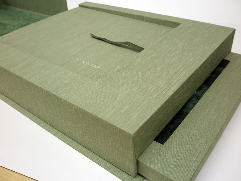 This clam shell box houses a Coptic sewn photo album on the top and is lined throughout with green suede leather. The pull out drawer on the bottom houses five matted images. The contour of a tree line is pressed into the front of the case. |